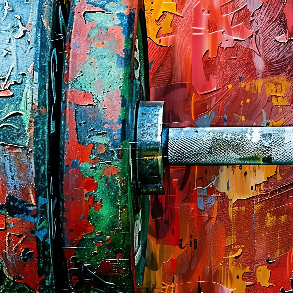 Details: gewichtheffen, sport schilderij, kleuren, gewicht, kracht, abstract, geel, blauw, rood, staal