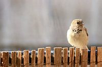 De meest voorkomende vogel in nederland, de kleine huismus zittend op een hekje in de tuin.