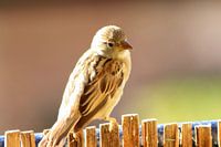 De meest voorkomende vogel in nederland, de kleine huismus zittend op een hekje in de tuin.