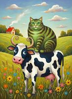 Een grillig tafereel toont een groen gestreepte kat die op een zwart-witte koe zit. Op de achtergrond is een weelderige weide met kleurrijke bloemen te zien.