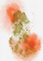Minimaal, gebarend abstract aquarelverfschilderij - zachte vlekken van helder rood en zacht groen vloeien in elkaar over, waardoor een dromerige en vloeiende compositie ontstaat. Kleine spetters voegen een dynamisch tintje toe en contrasteren met de zachte achtergrondtinten.