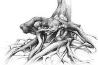 Geworteld in de aarde. Verweven vormen. Licht en schaduw. Zwart en wit. Stilte midden in het bos. De krachtige wortel van een boom zoekt zijn weg naar de aarde. Ik tekende de wortel in het origineel met zwarte micropigmentinkt op natuurlijk gekleurd papier. Het is een netwerk van dunne lijnen.