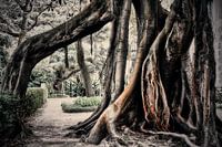 De foto toont een mystiek uitziende boom. Zijn wortels lijken krachtig en levend.