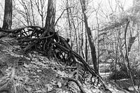Ontdek de pure schoonheid van de natuur met dit indrukwekkende beeld van verweven boomwortels op een boshelling. De krachtige compositie legt de rauwe structuur en organische vormen van de wortels bloot, die zich stevig vastgrijpen in de aarde. De zwart-wit uitvoering versterkt het contrast en benadrukt de tijdloze sfeer van rust,…