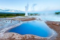 Het geothermische gebied rond Geysir is een van de hoogtepunten op de "gouden cirkel", een route die vaak bezocht wordt door toeristen. De geiser waarnaar het gebied vernoemd is, Geysir, is op vandaag de dag niet actief meer. De blauw gekleurde geiser op de voorgrond heet Blesi. De blauwe kleur wordt veroorzaakt de opgelost silicium. Op de achtergrond barst de geiser Stokkur uit, die op dit moment de meest actieve geiser van het gebied is. Een uitbarsting van kokend heet water en stoom kan een hoogte bereiken van bijna 40 meter.