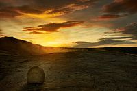 Zonsondergang op de plek waar de Geysir (Geiser) ooit vele malen spoot. Helaas werkt de geiser niet meer...