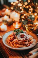 Een verleidelijk bord dampende spaghetti, gegarneerd met verse basilicum en een vleugje parmezaan, straalt gezelligheid uit. Omringd door het warme licht van kaarsen en feestelijke flair brengt dit scenario een gevoel van saamhorigheid en plezier in elke keuken. Perfect voor een inspirerende sfeer tijdens het koken en gezellig samenzijn.