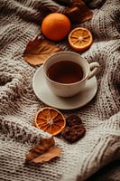 Een gezellig toevluchtsoord: warme thee in een elegant kopje, omringd door nostalgisch gedroogd fruit en herfstbladeren. De zachte textuur van de deken harmonieert met het warme kleurenpalet, terwijl het oranje fruit een fris accent toevoegt. Uitnodigend en gezellig - perfect voor ontspannende momenten.