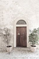 Deze foto toont de sfeervolle gevel van een huis in het oude Ortygia, gelegen in Syracuse op Sicilië, Italië. Het straatbeeld wordt gedomineerd door de warme uitstraling van de gevel, met in het middelpunt een donkerbruine houten deur.