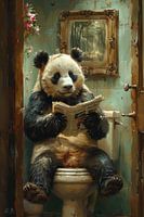 Een ontspannen panda leest een krant op het toilet in een stijlvol ingerichte badkamer.