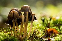 Vrij zeldzame inktzwam (Coprinus congregatus), de Spitscellige Donsinktzwam. Lichtbeige tot okerbruin. Een feeën rijk plaatje na een regenochtend in de Kaapse Bossen op de Utrechtse Heuvelrug.