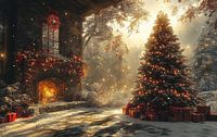 De afbeelding toont een gezellige woonkamer versierd voor Kerstmis. Een grote, versierde kerstboom staat in het midden, versierd met twinkelende lichtjes, rode ornamenten en een paar witte. De boom wordt omringd door een heleboel ingepakte cadeautjes, wat een feestelijke sfeer creëert. Een knapperend haardvuur met daarboven kousen voegt warmte en charme toe aan het tafereel.