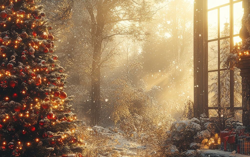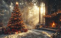 De afbeelding toont een gezellige woonkamer versierd voor Kerstmis. Een grote, versierde kerstboom staat in het midden, versierd met twinkelende lichtjes, rode ornamenten en een paar witte. De boom wordt omringd door een heleboel ingepakte cadeautjes, wat een feestelijke sfeer creëert. Een knapperend haardvuur met daarboven kousen voegt warmte en charme toe aan het tafereel.