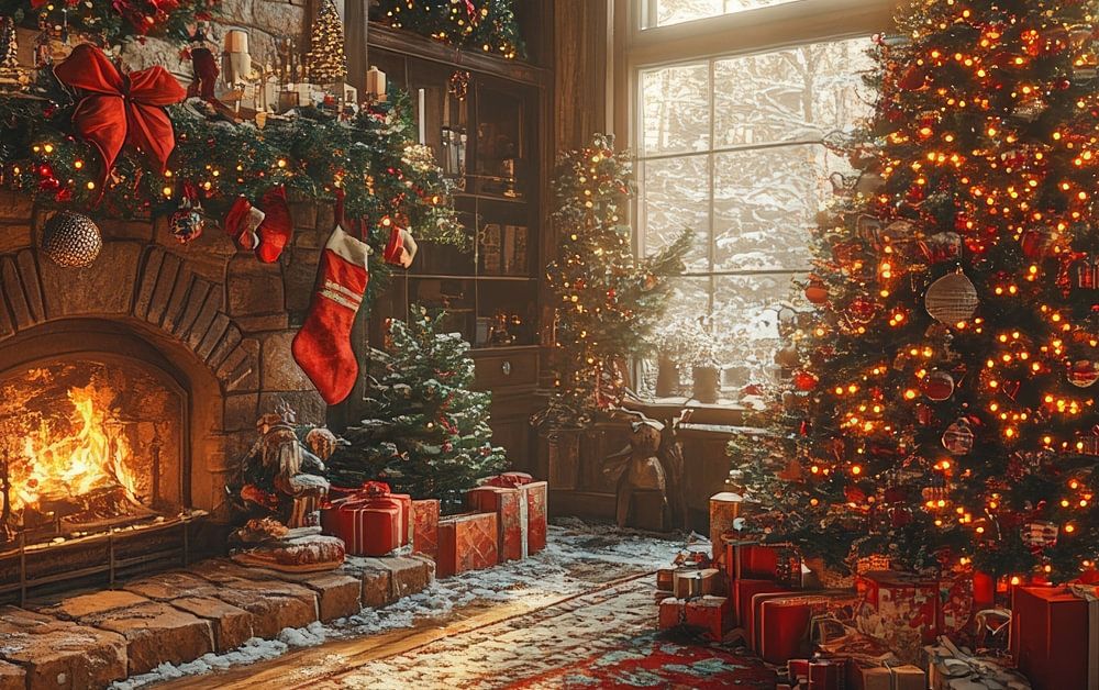 De afbeelding toont een gezellige woonkamer versierd voor Kerstmis. Een grote, versierde kerstboom staat in het midden, versierd met twinkelende lichtjes, rode ornamenten en een paar witte. De boom wordt omringd door een heleboel ingepakte cadeautjes, wat een feestelijke sfeer creëert. Een knapperend haardvuur met daarboven kousen voegt warmte en charme toe aan het tafereel.