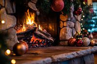 Zachte vlammen dansen en werpen warm licht op een rustieke stenen kachel, omlijst door feestelijke decoraties en glanzende kerstballen. Het knisperende vuur geeft de scène een uitnodigende gezelligheid die ideaal is voor een woonkamer waar familie en vrienden samenkomen om te genieten van de contemplatieve sfeer van de feestdagen.