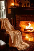 Er gaat een uitnodigende warmte uit van deze gezellige kamer, waar het knapperend haardvuur de duisternis zachtjes verdrijft. De comfortabele fauteuil, bedekt met een zachte, lichtgekleurde deken, nodigt uit om te blijven hangen. Een perfecte aanvulling voor elke woonkamer om te genieten van ontspannen avonden en contemplatieve uren.