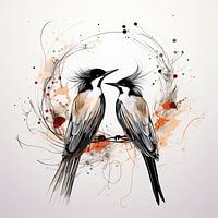 Een moderne illustratie van twee zwart-witte vogels met rode en oranje accenten, zittend op een draad boven een veelkleurig abstract landschap.