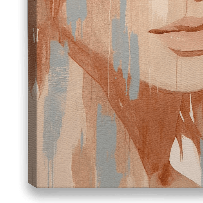 Gezicht | Hidden Thoughts in Color - Dit vrouwen schilderij toont een portret van een vrouw met een blinddoek van druipende verf in voornamelijk roest- en blauwtinten, uitgevoerd in een krachtige urban-stijl.