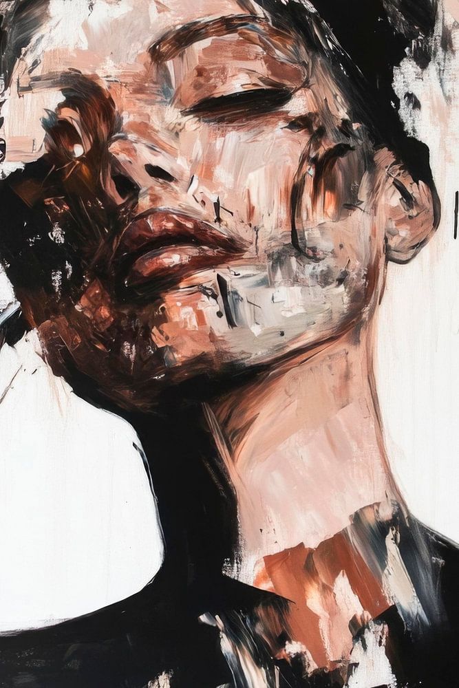 Een mysterieuze aanwezigheid ontvouwt zich in de torenhoge lagen van kleur en textuur. Blootliggende emoties stromen door dynamische penseelstreken, terwijl de zachte uitdrukking van het gezicht een duik neemt in een wereld van het onbekende. Grijze en aardse tinten smelten samen met delicate nuances die een fascinerende melodie van breekbaarheid en kracht suggereren.