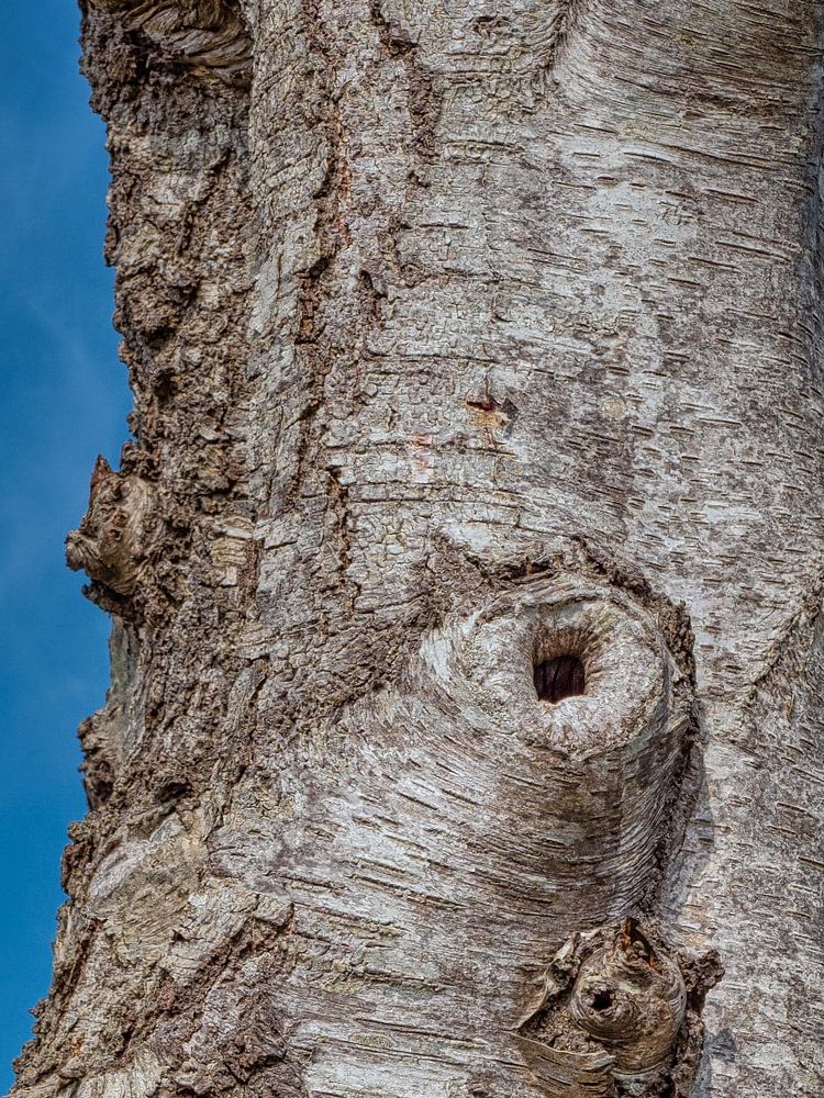 De knoesten in de boom vormen een gezicht. Tussen de twee ogen zit de overgang van het voorhoofd naar de neus met een enkel neusgat. Linksonder dan een ronde mond.