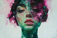 Er ontvouwt zich een fascinerend spel van kleuren en vormen, terwijl zachte, bloeiende nuances de essentie van een mysterieuze portretfiguur omhullen. De harmonieuze combinatie van blauwe en groene tinten roept een emotionele diepte op die perfect past in een slaapkamer of creatieve werkruimte, waar het inspiratie en rust uitstraalt.
