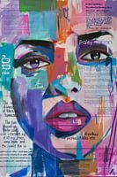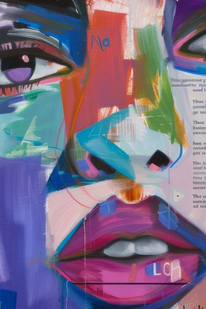 Het schilderij toont een fascinerend portret gemaakt met krachtige kleuren en dynamische penseelstreken. De ogen stralen intensiteit uit, terwijl de lippen glanzen in levendig roze. Tekstfragmenten vullen de compositie aan en de harmonieuze mix van groene en violette tinten geeft het gezicht een unieke diepte en expressiviteit.