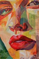 Het schilderij toont een indrukwekkend portret dat boeit door de levendige kleuren en abstracte vormen. Bijzonder opvallend zijn de sterk benadrukte lippen in een diep rood en het expressieve oog, dat het werk een fascinerende intensiteit geeft. De harmonieuze compositie creëert een boeiende diepte en complexiteit die de kijker naar binnen trekt.
