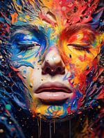 Het gezicht van een mooie vrouw is met veel kleuren beschilderd. Dikke lagen verf bedekken bijna het hele gezicht en druipen gedeeltelijk langs de kin naar beneden.