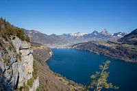 Gezicht op Brunnen en Rütli aan de oever van het Meer van Uri met de Kleiner en Grosser Mythen. Centraal Zwitserland.