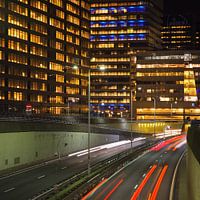 Utrechtse baan in Den Haag in het donker. verlichting, vierkant, beweging, snelweg, stad, kantoren, gebouwen, architectuur, urban, drukte