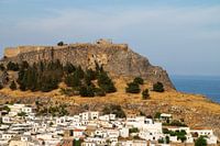 Gezicht op de Akropolis van Lindos op het Griekse eiland Rhodos met de Middellandse Zee op de achtergrond en witte huizen op de voorgrond