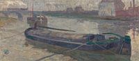 Hier ligt aan de waterkant een beurtvaartschip met op de achtergrond de stad.