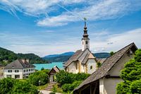 Gezicht op het oeverlandschap en de kerken van Maria Woerth aan de Woerthersee in Oostenrijk.