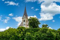 Gezicht op het oeverlandschap en de kerken van Maria Woerth aan de Woerthersee in Oostenrijk.