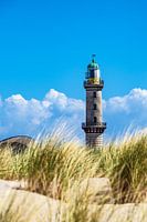 Uitzicht op de vuurtoren met duin in Warnemünde.