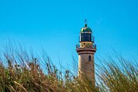 Gezicht op de vuurtoren met duin in Warnemünde van Rico Ködder
