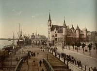 Gezicht op het Steen met de haven, Antwerpen, België (1890-1900)
