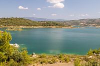 Panoramisch uitzicht op het stuwmeer van Gadoura in het binnenland van het Griekse eiland Rhodos met helder turkoois en blauw water en bergen op de achtergrond