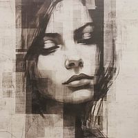 Portret van een vrouw, uitgevoerd in een monochroom kleurenschema, dat lijkt te zijn opgebouwd uit overlappende lagen en texturen. De vrouwelijke figuur is gepresenteerd met een serene, introspectieve uitdrukking, die een zekere mysterie en diepte suggereert. Het gebruik van krantenknipsels als achtergrond voegt een element van collage toe en suggereert een verhaal of context die verder gaat dan het visuele. De stroken die over het gezicht lopen, kunnen wijzen op de fragmentarische aard van identiteit of herinnering. Dit stuk is een samensmelting van traditionele portretkunst met moderne technieken, wat het een tijdloze allure geeft.