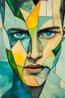 Een fascinerend samenspel van kleuren en geometrische vormen maakt indruk op de kijker. De helderblauwe ogen trekken onmiddellijk de aandacht, terwijl de contrasterende geel- en groentinten een diepe, emotionele verbinding creëren. Dit kunstwerk is bijzonder effectief in de woonkamer, waar het dient als een opvallend gespreksonderwerp.