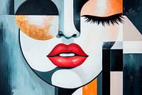 Een fascinerende compositie van geometrische vormen en heldere kleuren omlijst een expressief gezicht met felrode lippen en zachte ogen. De harmonieuze balans tussen donker en licht geeft de kamer een moderne elegantie. Dit kunstwerk is perfect voor de woonkamer, waar het dient als blikvanger en conversatiestarter.