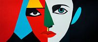 Een fascinerend spel van kleuren en vormen ontvouwt zich in dit kunstwerk. De contrasterende gezichten met hun levendige rood, blauw en geel trekken ieders aandacht. Perfect voor een woonkamer, het geeft de kamer een dynamische en tot nadenken stemmende sfeer die gesprekken stimuleert en creativiteit aanmoedigt.