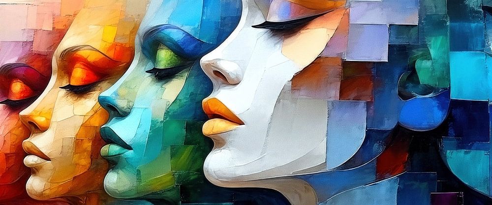 In dit artistiek vormgegeven werk, dat is opgezet als een panoramisch schilderij, ontvouwt zich een fascinerende compositie van acht vrouwengezichten met gesloten ogen, oplichtend in intense en gelaagde kleurschakeringen. Hun gelaatstrekken lijken te zijn samengesteld uit geometrische fragmenten - alsof ze deel uitmaken van een gelaagd droombeeld of een surrealistisch visioen.