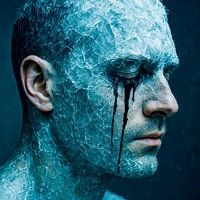 Een stil, bijna pijnlijk intens portret dat de kijker direct raakt met zijn rauwe symboliek. De huid van de man lijkt bevroren - en niet alleen in metaforische zin. Het is bedekt met een laag ijs, gebarsten, gebroken in lagen, alsof de tijd zelf zich heeft vereeuwigd in het oppervlak.