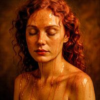 Dit portret toont een vrouw met gesloten ogen, haar gezicht in balans tussen uiterlijk licht en innerlijke rust. Een honingachtige, gouden vloeistof stroomt zachtjes over haar voorhoofd, wangen, schouders en borst - alsof ze baadt in een stroom van licht die geen warmte maar zachtheid met zich meedraagt.