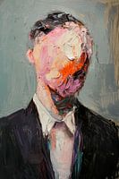 Een mysterieus personage in een net pak, wiens gezicht lijkt te zijn versmolten uit levendige, pastelkleurige penseelstreken. De abstractie laat ruimte voor interpretatie - wie of wat verbergt zich achter deze surrealistische façade? Een spel met identiteit en perceptie dat de kijker aan het denken zet.
