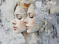 GezichtsKunst | Vrouwenhoofden - Dit vrouwen schilderij toont twee gezichten van vrouwen die subtiel in elkaar overgaan met een achtergrond die elementen van abstracte texturen en zachte overgangen van wit, grijs en zwart bevat.