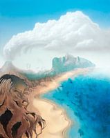 De surrealistische afbeelding toont een landschap met wolken, vuklan, bergen, strand en zee, waarin verschillende gezichten zijn verwerkt