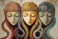 Gezichtskunst | Rustige Reflectie - Dit vrouwen schilderij toont drie serene gezichten met rijk gedecoreerde hoofddoeken in aardse en metaalkleuren, en wekt een gevoel van rust en contemplatie op.