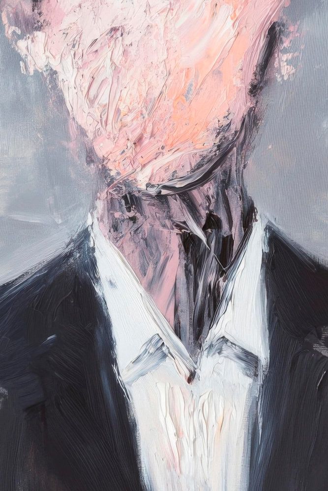 Een gecodeerd wezen, in een donker pak en met een wazig hoofd, belichaamt de ontsnapping aan identiteit en het individu. De pastelkleurige vervaging van het gezicht weerspiegelt innerlijke conflicten, terwijl de grijze achtergrond isolatie en anonimiteit benadrukt. Een fascinerend samenspel tussen vorm en leegte dat tot nadenken stemt.
